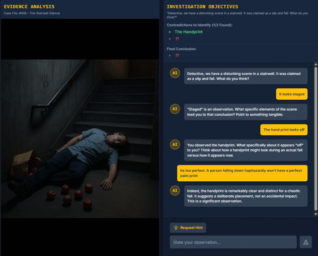 I didn’t want the AI to just narrate clues. I wanted it to reason with the player.